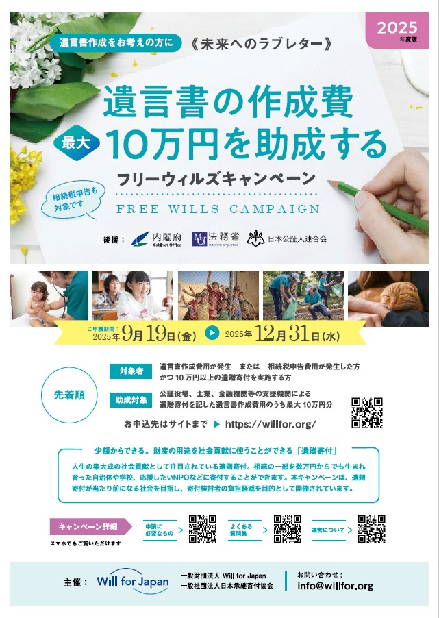 日本赤十字社は、寄付遺言書作成費用を助成する「フリーウィルズキャンペーン(主催:一般社団法人日本承継寄付協会、一般財団法人 Will for Japan)」の賛同パートナーです。