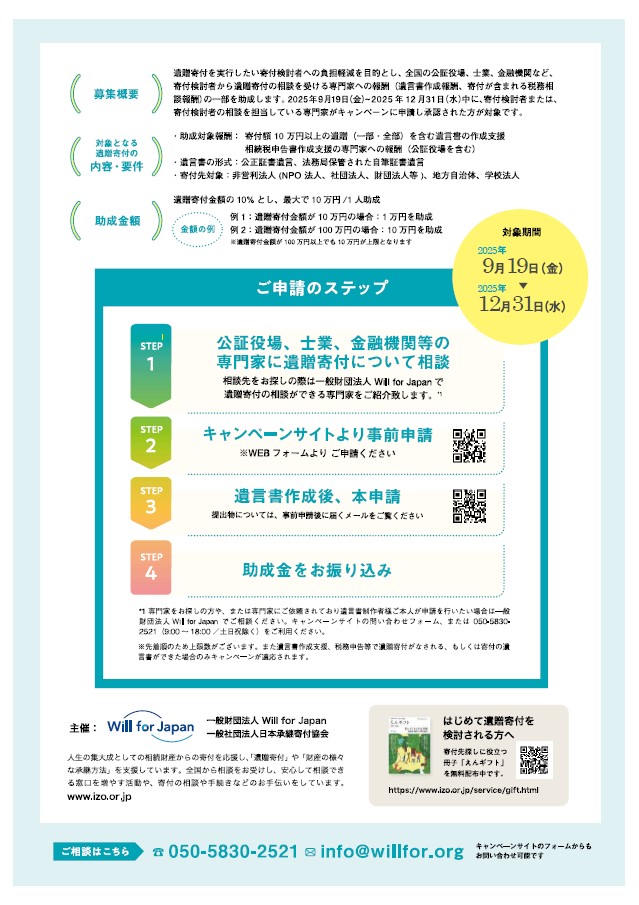 遺贈寄付の遺⾔書作成に伴う費用の一部(最大10万円)が助成されるキャンペーンです。