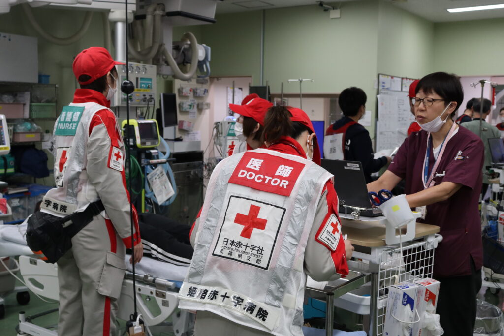 本研修は各種救護員研修の総括として、実施設を用いて災害発生初動期における医療救護活動や多数傷病者の受入れ・増床・応援体制を確認することを目的に行われました。神戸赤十字病院並び兵庫県災害医療センター職員、及び姫路赤十字病院・多可赤十字病院の救護班、兵庫県支部職員、姫路赤十字看護専門学校の学生らが参加しました。